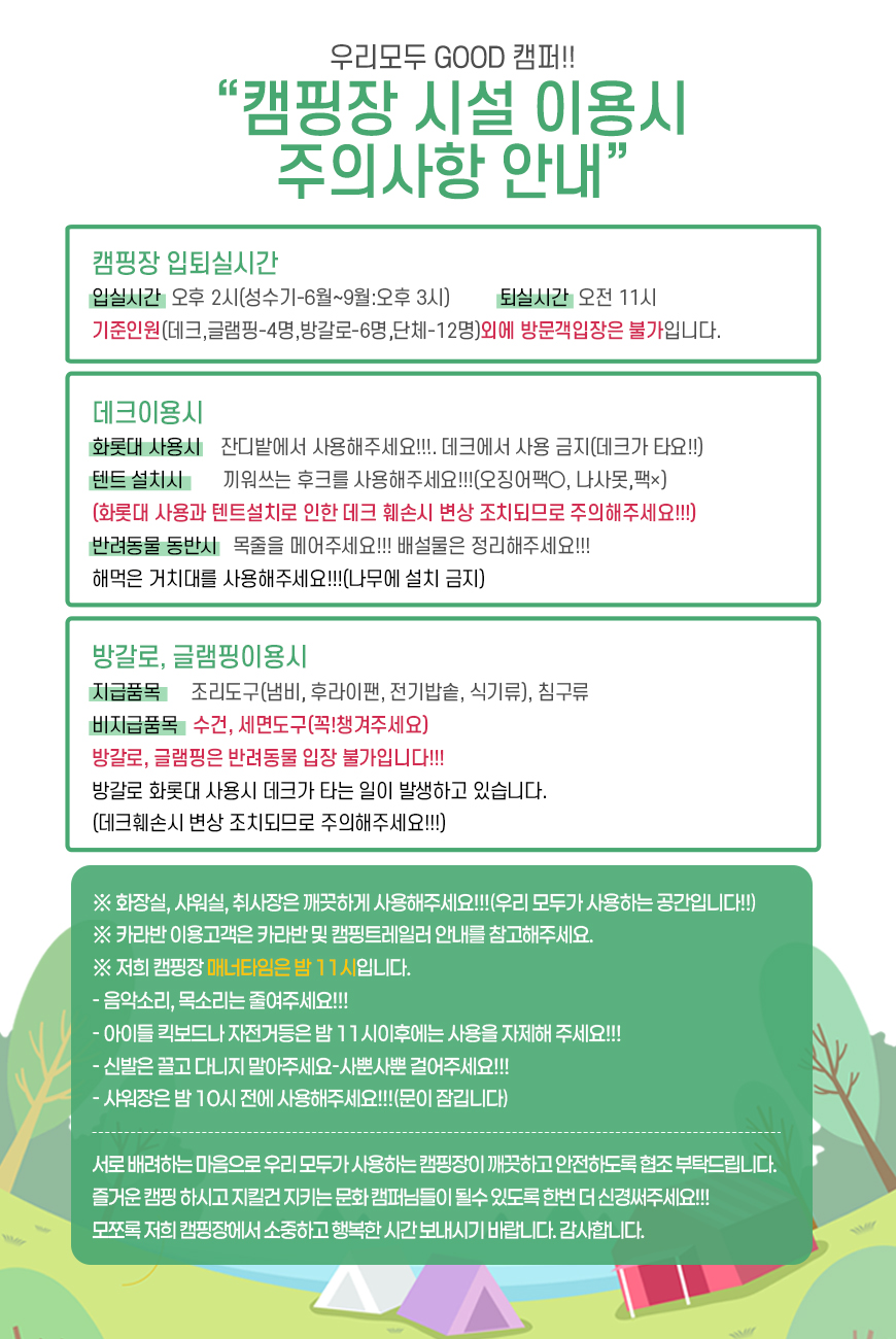 캠핑장 시설 이용시 주의사항 안내입니다.
